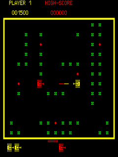 In Super Tank, up to two players simultaneously control highly mobile armored tanks on a mission to destroy the SUPER TANK. An introductory collection round challenges the players to clear a field of mines and destroy as many red enemy tanks as possible. Special glowing diamonds are scattered throughout, providing temporary super armor protection and making the players’ task easier.